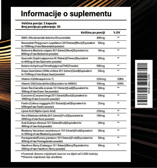 NAD+ 60 kaps;sa Resveratrolom,Berberin,Fisetin,Quercentinom i mešavinom biljnih extrata (Acai,Noni,Kurkuma,Zeleni caj,Glog,Borovnica.Nar , Extract Crnog Bibera,VitaminD3+K2)...za PODMADJIVANJE,protiv starenja, i Imunitet sa Antioxidantima