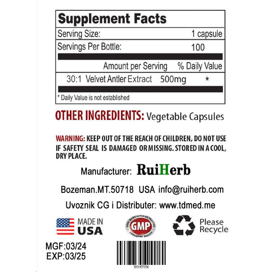 DEER ANTLER VELVET Extract/IGF-1;100 caps./500mg; Baršuna od jelenjih rogova;RuiHerb USA