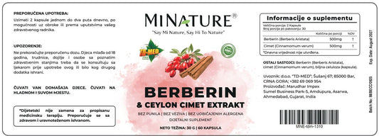 Berberine + Cimet-Ceylonski Extrakt ,500 mg, 60 veg.caps;Snižava šećer u krvi, uzrokuje gubitak težine i poboljšava zdravlje srca i smanjuje insulinsku rezistenciju - "Mi Nature"Indija original brend