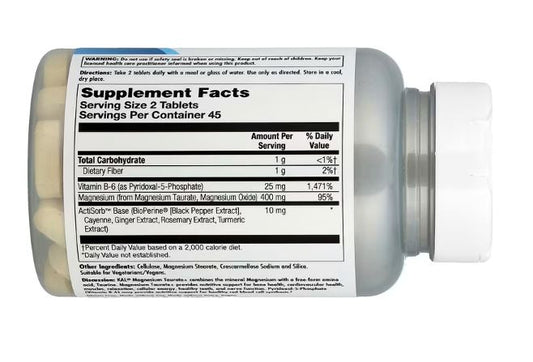 Magnesium Taurate +,400mg, 90 tableta - Kal.USA; za kardiovaskularno zdravlje(problem Aritmija), podrška nervnom sistemu i potencijalno poboljšan san. Poznat je po tome što je blag za želudac i potencijalno pomaže u apsorpciji magnezijuma u mozak