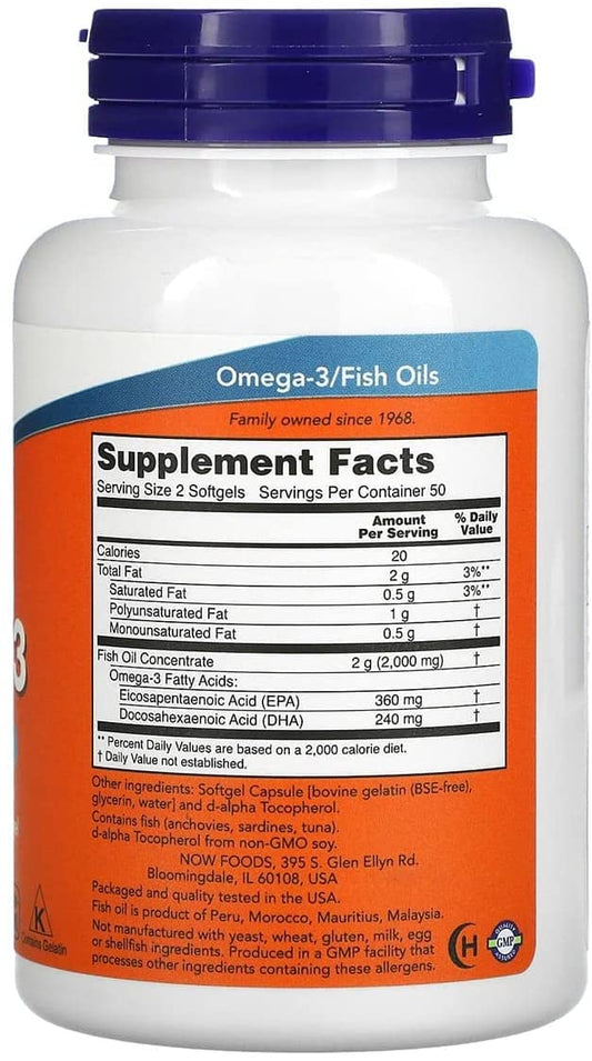 Omega-3 1000mg, 180 EPA / 120 DHA, 100 mekih kaps. NOW Foods,USA