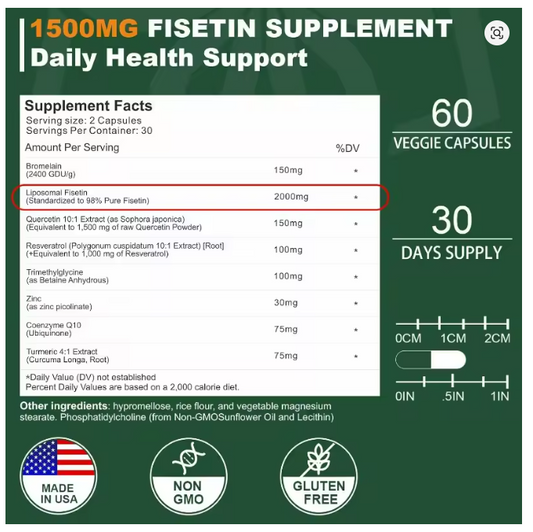 LIPOSOMAL FISETIN 2000mg/60 caps sa dodatcima (Kvercetin 10:1;Resveratrol 10:1;Koenzim Q10;Cink (pikolinat);Trimetilglicin (TMG);Bromelain i Kurkumom;Za kognitivnu podršku, zdravlje ćelija i usporavanje starenja;Prvi put kod nas sa REKLAMNOM cijenom!