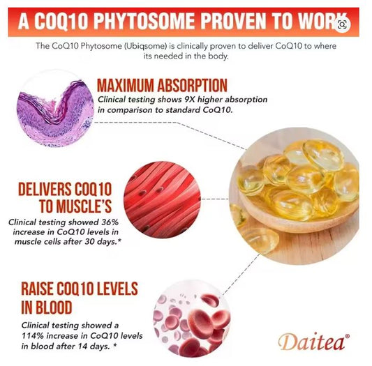 CoQ10-300mg u 2 kaps.dnevno-maksimalna doza;podržava funkciju srca, poboljšati cirkulaciju krvi i smanjiti rizik od kardiovaskularnih bolesti,više energioje i borbe sa aritmijama ,nepravilnim radom srca i štiti zdravlje mozga i živaca..Daitea USA