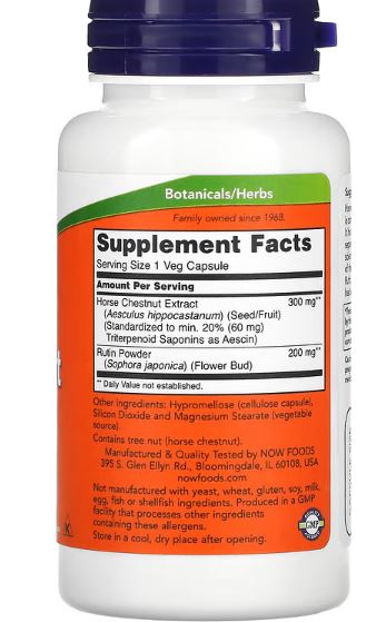 Divlji kesten(Horse Chestnut) + Rutin, 300 mg, 90 veg.kaps.Now Foods;Kombinacija escina i rutina poboljšava protok krvi u kapilarima, korisno za hladne ekstremitete, i dijabetičke angiopatije,za tretman prošinenih vena,hemoroida i otoka...