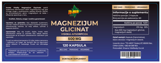 Magnesium GLICINAT(Glycinate) - 500 mg u 2 kapsule;Ublažava stres,bol i grčeve mišića,pomaže kod dijabetisa2,zdravlja srca i nervnog sistema;60 kaps.,VISOKE APSORCIJE,naš Brend za TD-MED