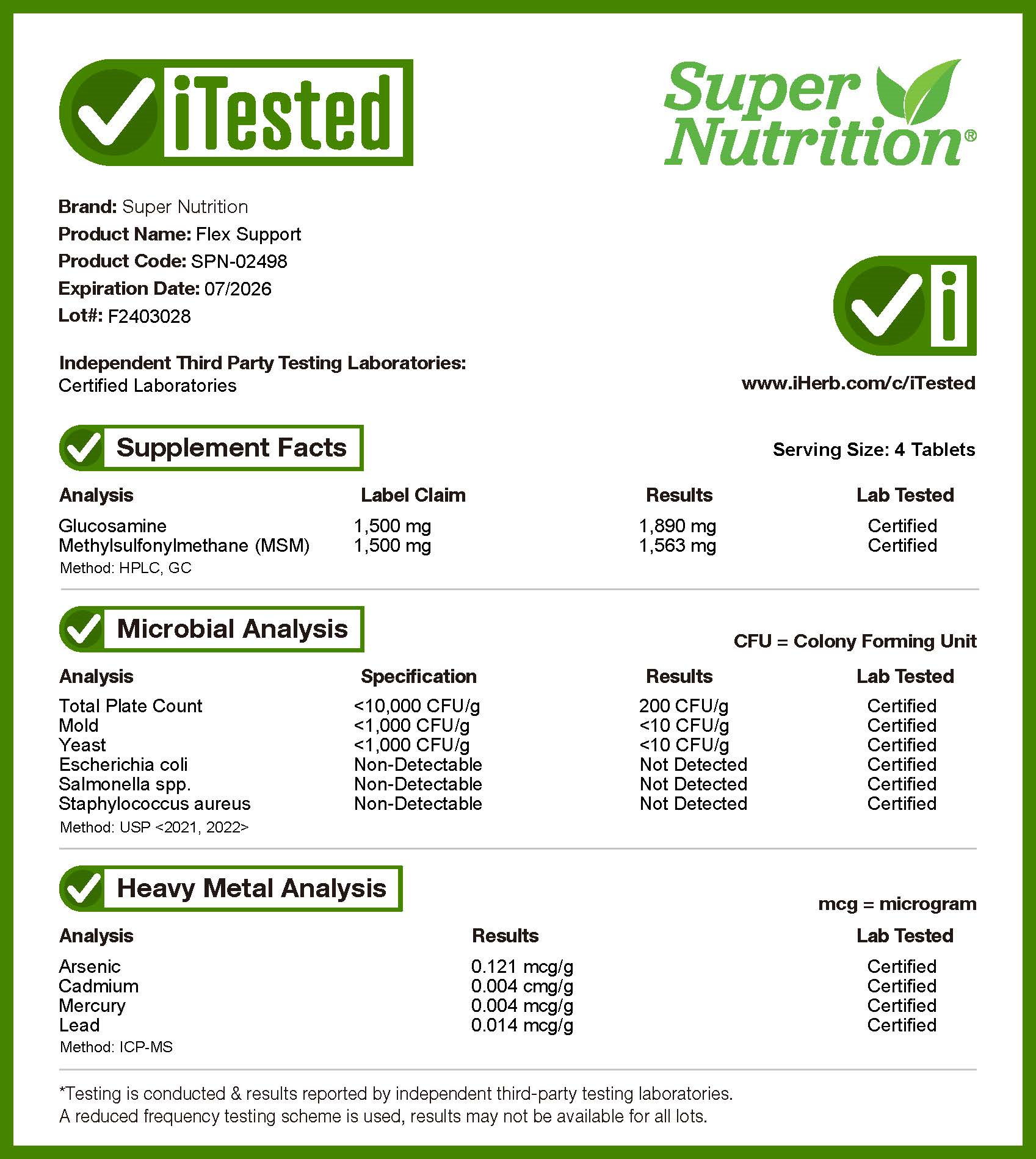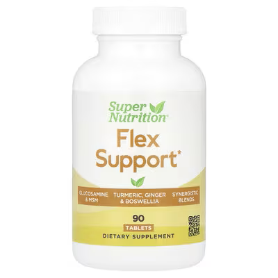 Super Nutrition® Flex Support* formuliran je s klinički podržanim sastojcima koji pomažu u održavanju zdravlja zglobova. Ova formula kombinira glukozamin i MSM s patentiranom mješavinom ekstrakata Kurkume, Đumbira i Bosvelije, zajedno s Hijaluronskom kiselinom, kako bi podržala cjelokupno zdravlje zglobova. Osim toga, patentirana mješavina za probavu, koja uključuje enzime poput amilaze, proteaze i lipaze, zajedno s ekstraktima đumbira i crnog papra, podržava probavu i apsorpciju hranjivih tvari.