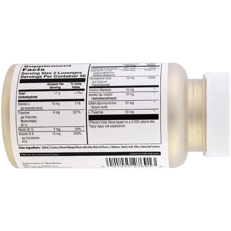 Formulirana za pružanje podrške za povremeni stres, KAL GABA L-Theanine Stress B pastile mogu takođe pomoći u podršci zdravom opuštanju, fokusu i osećaju blagostanja. Sa GABA (gama aminubasnom kiselinom), L-teaninom (aminokiselinom), vitaminima B-Complexa i ukusnim prirodnim okusom mandarine od manga, naša formula je snažna koliko i ukusna! Za dodatnu podršku uključeni su i vitamin C, folna kiselina, pantotenska kiselina, holin i inozitol.