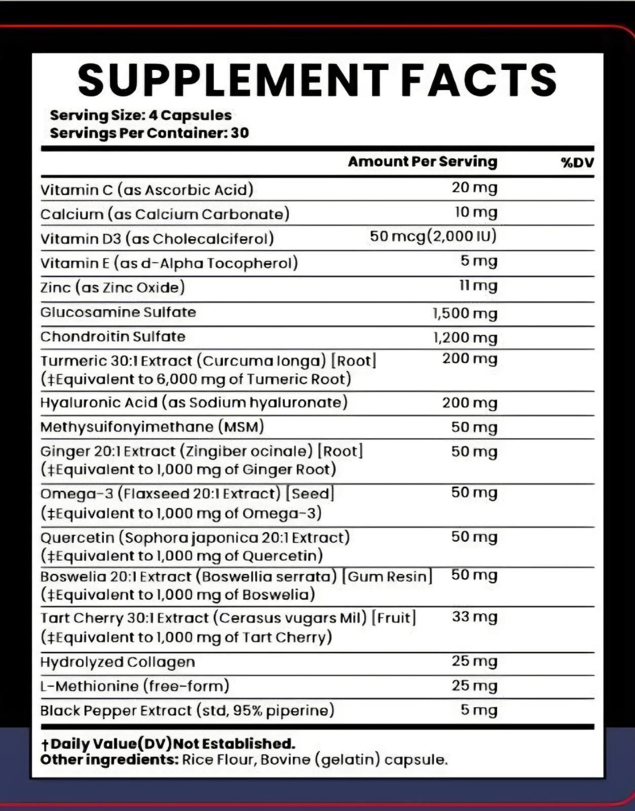 - Plus komplex Vitamina ( Vit.C,D-3 i Vit.E) i Minerali za zdravlje kostiju (Zinc+ Kalcijum).kao i dodatak Đumbir Extrata 20:1,Kisela Višnja(Tart Chherry Extract 20:1) i naracno Biopperin Extract 95% zbog bolje apsorcije sastojaka