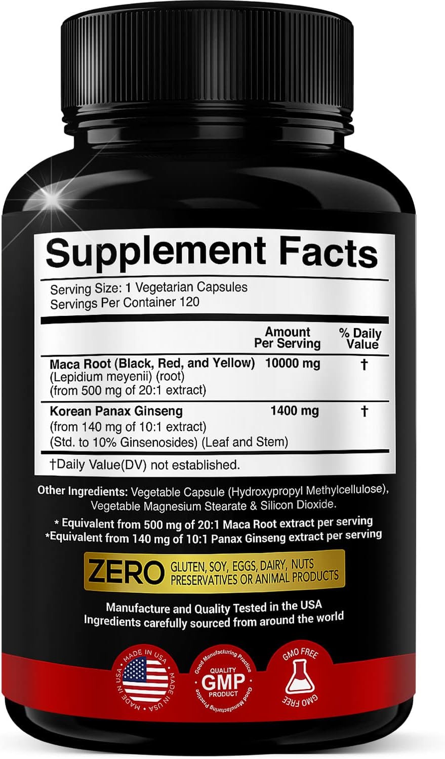 - PROIZVOĐENO U SAD - Da bismo osigurali samo najkvalitetniji proizvod, svi naši proizvodi se proizvode u GMP certificiranoj bez GMO tvornici u SAD-u. Ponosni smo što nudimo prirodni preparate zasnovane na istraživanju, formulisane koristeći samo vrhunske sastojke za maksimalnu efikasnost; naše Maca root plus Panax Ginseng kapsule za muškarce i žene su prilagođene veganima i ne sadrže gluten, soju, jaja, mliječne proizvode, orašaste plodove ili konzervanse.