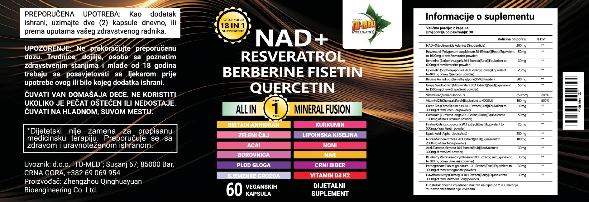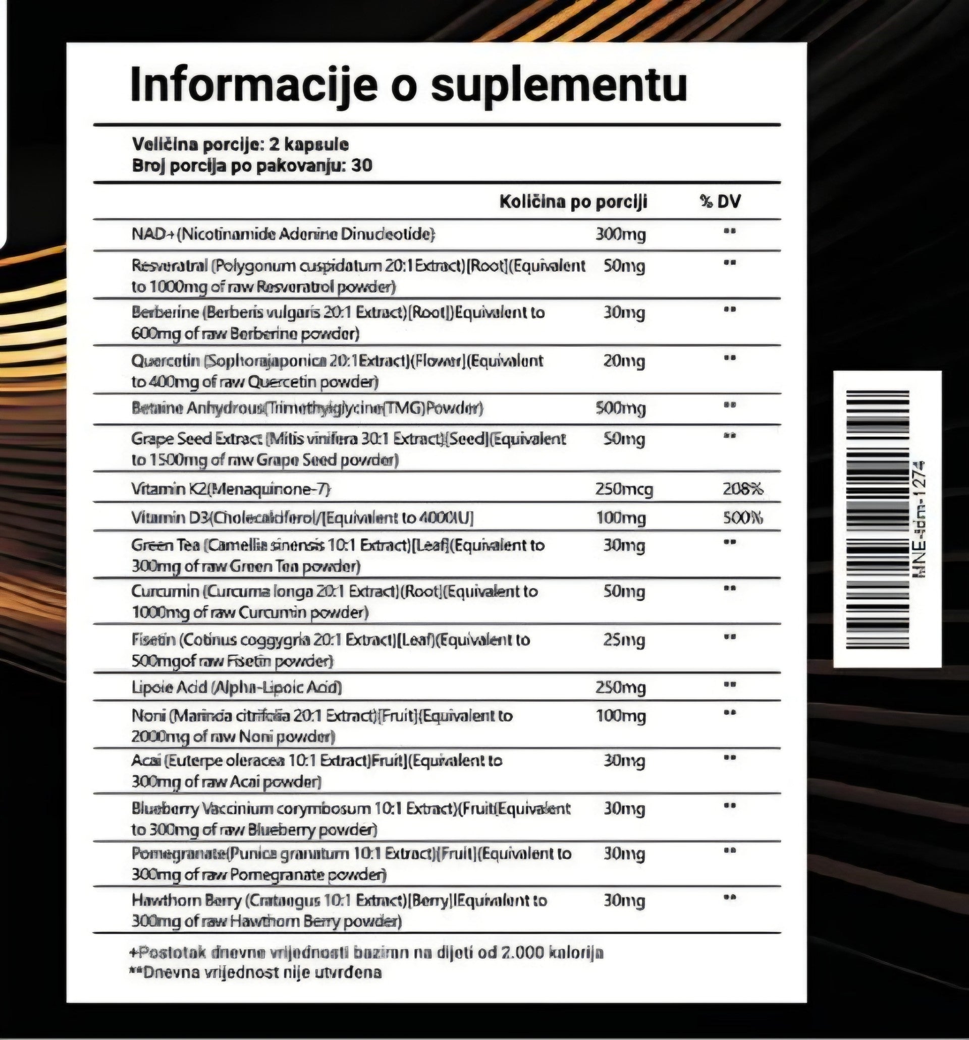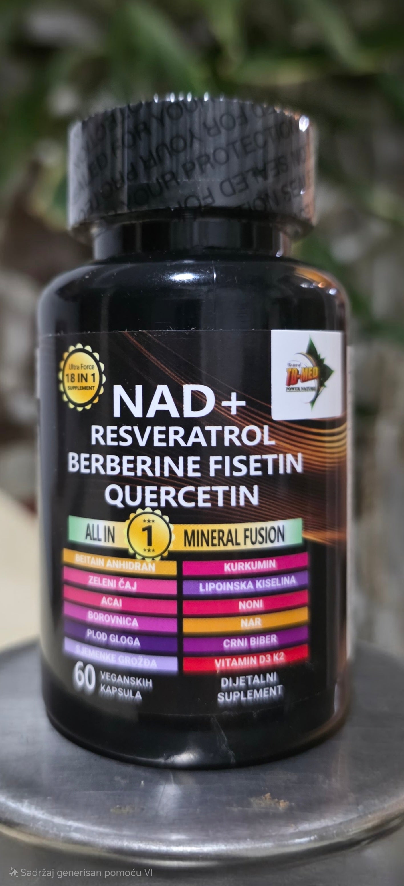 NAD+ 60 kaps;sa Resveratrolom,Berberin,Fisetin,Quercentinom i mešavinom biljnih extrata (Acai,Noni,Kurkuma,Zeleni caj,Glog,Borovnica.Nar , Extract Crnog Bibera,VitaminD3+K2)...za PODMADJIVANJE,protiv starenja, i Imunitet sa Antioxidantima
