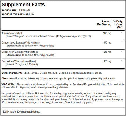 Resveratrol je polifenol antioksidans koji se pretežno nalazi u japanskom knotweedu i crnom vinskom grožđu. Ovo biljno jedinjenje se takođe prirodno nalazi u kikirikiju, kakau i raznim bobicama. Dodatak je najbolji način da dobijete koncentrirani oblik ovog moćnog sastojka.Lindberg Resveratrol